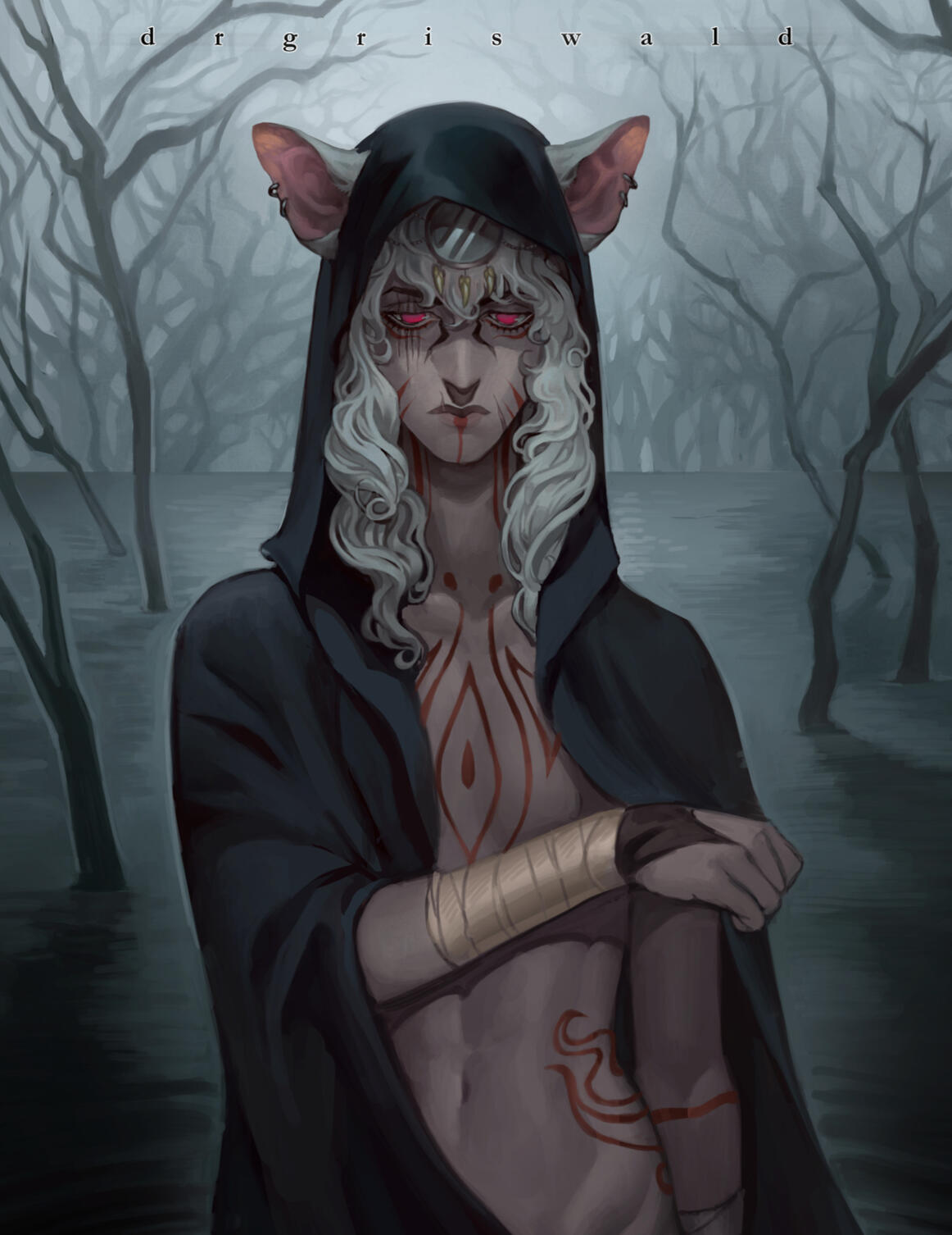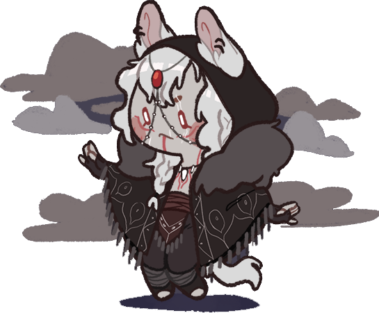 APPEARANCE They don’t belong anywhere but the Shroud—and it shows.Pale, near-luminescent skin veiled in ash-dark robes, with crimson eyes that cut through the fog. Their body is etched with secrets: red tattoos coiling like warnings across their chest and face, the meanings long buried in silence.Up close, the truth begins to fracture through. Claw-mark scars frame their right eye—jagged and unforgiving. A Keeper might flinch in recognition: punishment. A wound delivered by kin.Other scars are more subtle—an old slice at the lip, a gash near the jaw—marks not of cruelty, but survival. Under their robes is much the same.They wear their past in layers: loose, traditional garb that conceals more than it reveals. Thick furs, soft cloth, bone, and antler. Trinkets whisper of ritual and memory—tarnished rings, a bone-etched talisman, and a delicate garnet chain like a crown of old blood. Their cloak is immaculate, it was never made for hunting but rather ceremonial in nature.Their voice—quiet. Unearthly. A lullaby sung in an extinct tongue.Their scent—the Shroud itself: moss, rain, elder bark... and the faint ache of crushed herbs and wildflowers long buried.