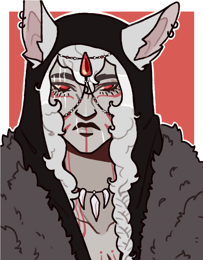 APPEARANCE They don’t belong anywhere but the Shroud—and it shows.Pale, near-luminescent skin veiled in ash-dark robes, with crimson eyes that cut through the fog. Their body is etched with secrets: red tattoos coiling like warnings across their chest and face, the meanings long buried in silence.Up close, the truth begins to fracture through. Claw-mark scars frame their right eye—jagged and unforgiving. A Keeper might flinch in recognition: punishment. A wound delivered by kin.Other scars are more subtle—an old slice at the lip, a gash near the jaw—marks not of cruelty, but survival. Under their robes is much the same.They wear their past in layers: loose, traditional garb that conceals more than it reveals. Thick furs, soft cloth, bone, and antler. Trinkets whisper of ritual and memory—tarnished rings, a bone-etched talisman, and a delicate garnet chain like a crown of old blood. Their cloak is immaculate, it was never made for hunting but rather ceremonial in nature.Their voice—quiet. Unearthly. A lullaby sung in an extinct tongue.Their scent—the Shroud itself: moss, rain, elder bark... and the faint ache of crushed herbs and wildflowers long buried.